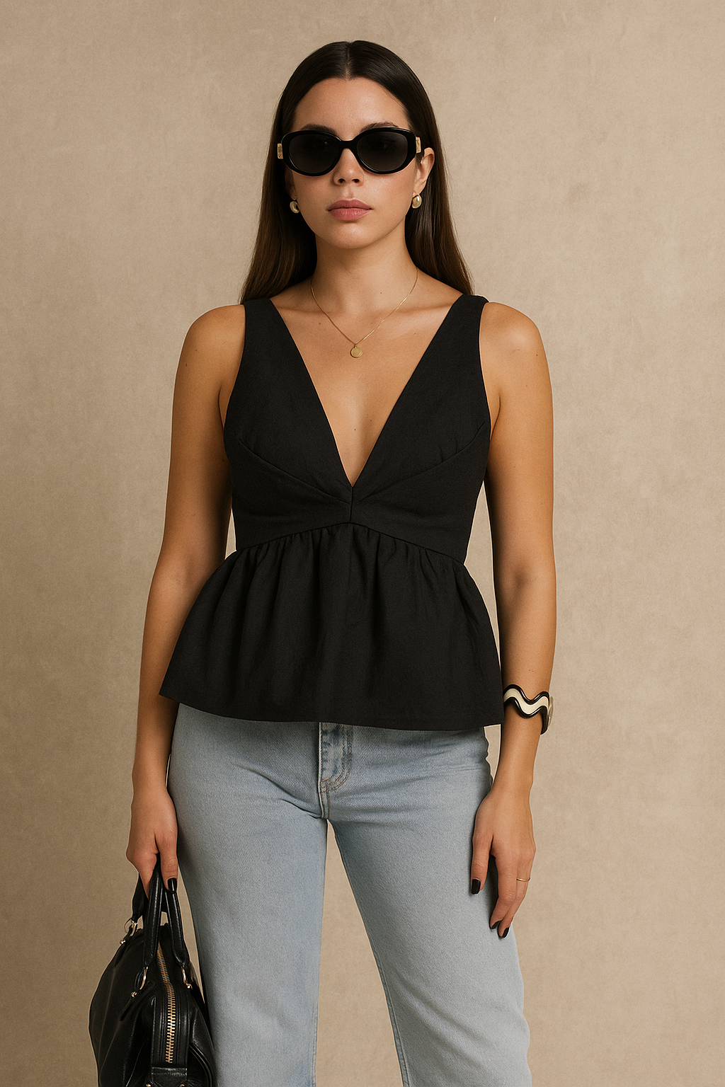 Bold, sleek, and effortlessly sculpting – the Midnight Muse Peplum Top is made for moments that call for quiet power. With a plunging neckline and softly flared waist, it frames your silhouette with confidence and charm. Pair it with denim for day or elevate it with tailored trousers for night.